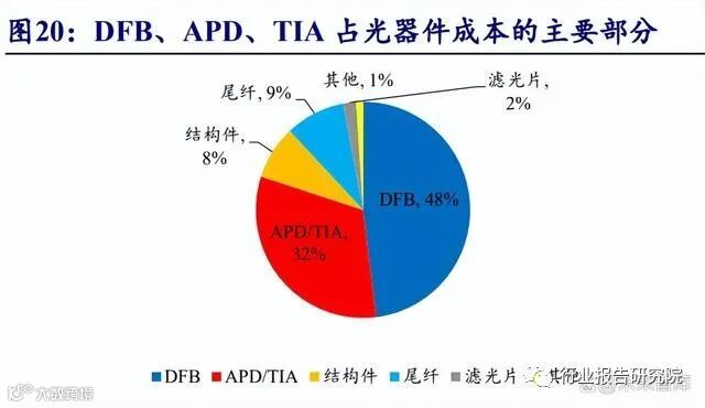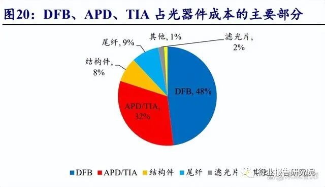 衡量 ROSA 性能的核心指标是灵敏度和接收光功率。灵敏度。保证误码仪在一 定误码的条件下,接收端所能接收到的最小光功率称为灵敏度。在高速率传输中, 灵敏度越小,光模块性能越强。接收光功率。在一定的误码条件下,接收端能够接 收到从光源发出光信号的强度,称为接收端光信号。从成本角度来看,光模块成本受光/电芯片以及控制芯片的影响较高。根据华拓 光通信的数据,光器件占光模块成本的比重为 73%,具体包括光器件元件(46%) 和 DFB/APD 芯片(27%)。控制芯片占光模块成本的比重为 18%,仅次于光器件。光器件的成本结构中,DFB 占比最高,达 48%;其次为 APD/TIA,合计占比 32%。
