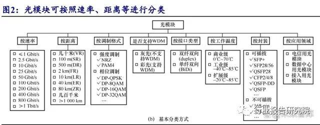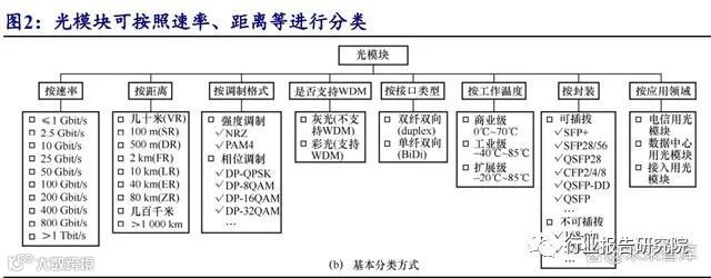光模块是实现光信号输入过程中光电转换和电光转换功能的光电子器件。所有信息通信信号初始状态都是电信号(模拟/数字),否则 IC 芯片无法处理。要实现光 纤通信,信号发射端需要将电信号转换为光信号,通过光纤传输到远端。信号接收 端,光探测器接收到光信号,并转化成可处理的电信号。光模块可按照速率、距离、 封装方式等多种类型进行分类。从封装来看,光模块有多种封装形式,适配不同尺 寸、功耗和速率需求。目前光模块的封装以可插拔形式为主,具备小尺寸、低功耗 的优势,部分长距高速相干领域追求高性能,仍采用不可插拔形式。随着交换容量 增大、端口密度变大、功耗增加等挑战日益严峻,LPO/CPO 成为行业重要的技术创 新。