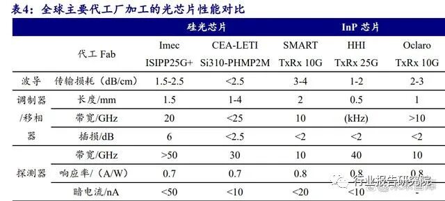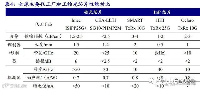 对比全球主要代工厂加工的光芯片性能,硅光与 InP 各有利弊。波导传输损耗 方面,两种材料体系相差不大,都在 1-3 dB/cm 之间;调制器方面,硅光的带宽更大, 但是插损高于 InP;探测器方面,硅光带宽更高,但是响应率低于 InP。硅光是提高集成度、实现重复性生产的关键。根据全球主要代工厂的数据,硅 光单位面积的流片成本相对 InP 没有体现出优势,尽管硅光的原材料成本以及晶圆 价格较低于 InP。其主要是受工艺的成熟度、封装难度以及生产良率的影响。但 InP 在晶圆尺寸上较大,单片 MPW 的流片数量较少,集成度方面存在劣势。硅光的成 本优势有望在规模化后体现出来。硅光与 CMOS 工艺相兼容,有望充分利用硅制造 技术的规模、成本和工艺控制等优势。在 AI 的推动下,数据中心对光模块的需求量 预计大幅提升,硅光有望迎来新的产业化机遇,受到部分云计算厂商的青睐。