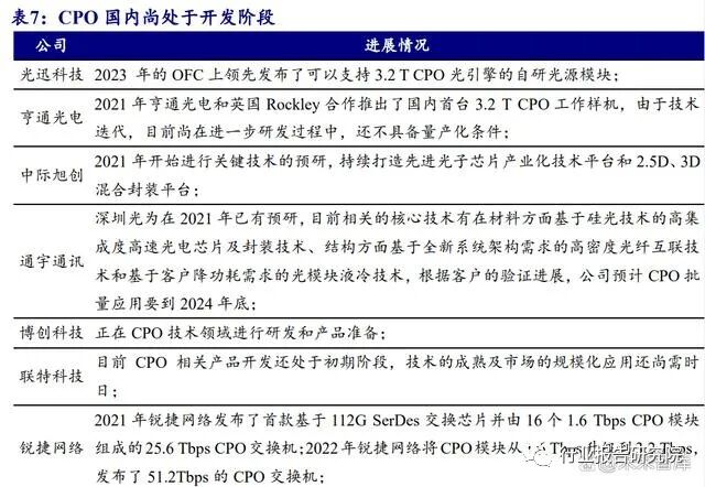 与国外相比,我国企业则普遍较晚进入 CPO 领域,在产品开发进度及技术研究 方面存在明显的差距。CCITA 牵头的 CPO 标准是当前我国唯一原生的 CPO 技术标 准,其目的是结合目前国内外在光互连技术发展及应用场景的差异,联合国内光模 块、光收发芯片、电驱动放大芯片、光源、连接器等厂商,共同打造更加适合我国 的 CPO 标准。光迅科技、中际旭创、华工科技、新易盛、阿里云、通宇通讯、海信、 博创科技、联特科技等都已开始涉足光电共封领域,但由于起步较晚,目前还没有 CPO 相关的产品推向市场,主要产品还都集中在 400G、800G 的硅光模块。