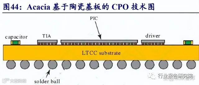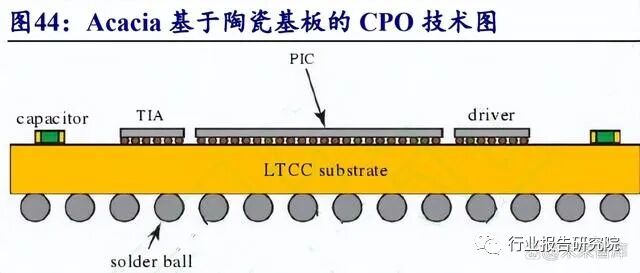 基于 2D 封装的 CPO 技术是将 PIC 和集成电路并排放置在基板或 PCB 上,通过引线或基板布线实现互连。2D 封装的优点是易于封装、灵活性高,EIC 和 PIC 都 可以使用不同的材料、利用不同的工艺单独制作。根据芯片和基板互连方式不同, 基于 2D 封装发展出了基于 Wire bonding 的 CPO、基于倒装的 CPO、基于扇出型晶 圆级封装技术的 CPO 三种技术路径。台积电在 2021 年推出了紧凑型通用光子引擎 COUPE 技术,将 EIC 和 PIC 放置在同一基板上,通过引线键合的方式在基板上实现 互连。Acacia 于 2017 年利用 CPO 技术设计了一款相干模块,将 PIC、驱动器芯片 和 TIA 倒装焊在一个 11 层的低温共烧陶瓷基板上,相对于 PCB 大大节省空间。信 号通过陶瓷基板内部走线互连,具有较短的路径和良好的电学性能,相比于在 PCB 上走线大幅减少了传输损耗。
