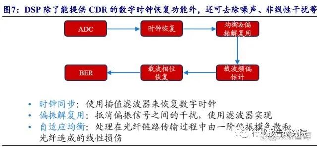 DSP 技术是相干通信的重要支撑,是其产业化应用的基础。当光传输速率达到 50G 以上,光纤偏振模色散影响加剧,严重影响链路有效传播距离与信号质量,此 时 DSP 对抗和补偿作用就愈发凸显。而传统的非相干通信通过光路补偿器件进行色 散补偿,其效果远差于 DSP。DSP 技术的成熟导入,省去了系统中原有的色散补偿 模块,使得长距离传输的链路设计更加简单,降低传输成本。