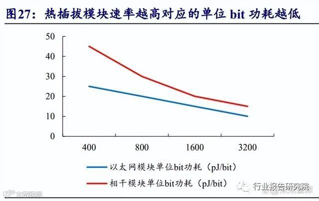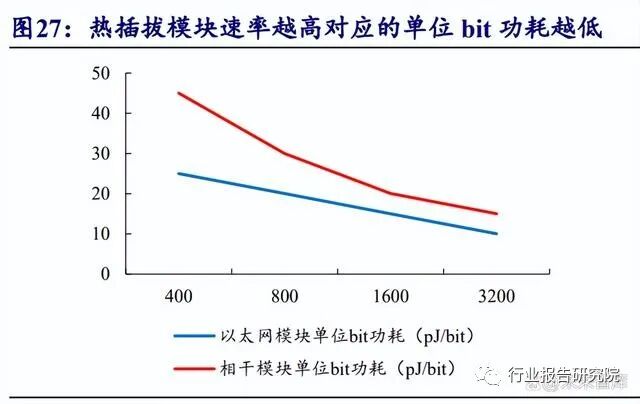 随着行业对低功耗、低成本、高集成度光模块的需求愈发旺盛,硅光凭借更低 的材料成本,更高的集成度成为重要的技术研发方向。根据 Equnix 预测,以一个拥 有超过 10万台服务器和 5万多个交换机的数据中心为例,它们之间的连接需要超 100 万个光模块,花费在 1.5 亿美元至 2.5 亿美元之间,占据数据中心网络成本的 60%, 超过交换机、NIC 和电缆等设备的总和。硅光模块虽然工艺难度大,封装成本较高(约 1.5-2 美元/GB),但其成本理论上有望降至 0.3 美元/GB,在规模量产情况下发挥成本 优势。CPO 的出现主要是为了解决高频电链接距离的问题。数据中心带宽的增长导致 SerDes 速率不断提升,功耗随之增加。为了保障信号的高质量传输,优化 SerDes 功 耗,信号传输距离将会相应缩短,即交换芯片和光模块之间的封装距离需要进一步 缩短。除此之外,随着数据中心内部流量的不断增长,每根光纤的传输容量也在不 断提升,而数据中心光纤的单芯容量只有 100-400G,要做到大规模的数据吞吐意味 着需要不断增加通道的数量,CPO 可以提高集成度。根据数据显示,通过采用 CPO 技术,光学连接所需的功率有望降低 50%以上。