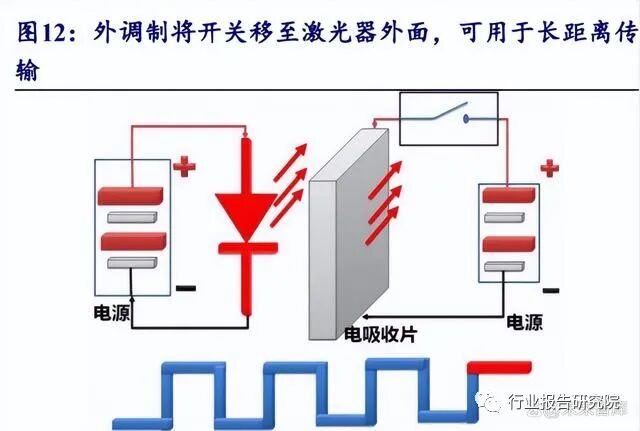 FP 主要应用于低速率短距离传输,结构和制造工艺简单,成本较低。DFB 以 FP 为基础,布拉格光栅集成到激光器内部的有源层中,在谐振腔内形成选模结构, 实现单纵模输出,主要用于高速中长距离传输。EML 集成了 EAM(光吸收调制器) 和 DFB,属于外调制激光器,具有大调制带宽、低频率啁啾的特点,更好地解决了 色散的问题,信息传输质量高,能够实现高速率长距离传输。