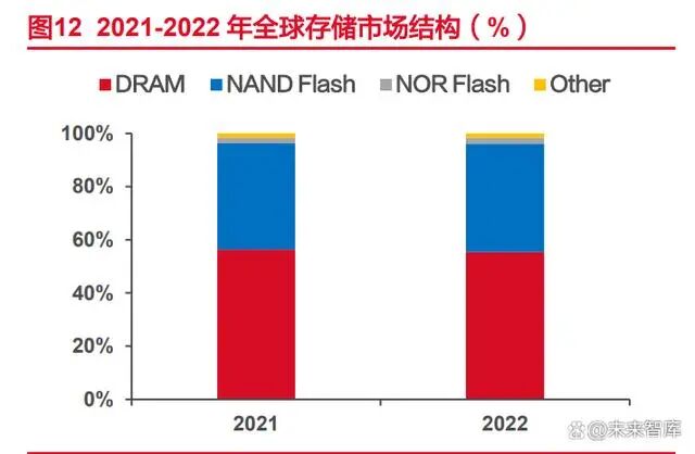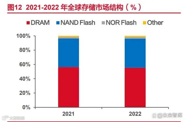 (1)DRAM 和 NAND 占 2022 年存储市场的 96%左右,是模组厂业务的核心部分。根据 Yole Group 数据显示,2022 年存储芯片整体市场规模达到了 1440 亿美元,其中 DRAM 收入 797 亿美元,占整个存储市场比例为 55.3%,较上年-1.0pct;NAND 实现收入 587 亿美元,占比达 40.8%,较上年+0.8pct;NOR 实现收入 32 亿美元,占比达 2.2%,较 上年+0.1pct。同时,Yole 预测 2021 到 2027 年,存储市场整体规模平均每年将会有 8%的 增长,到 2027 年将达到 2630 亿美元,其中 DRAM 和 NAND 依然占据绝对主导地位,预 计在 2027 年 DRAM 合计占比达 96.6%。DRAM 和 NAND 市场空间广阔,也是模组业务的 核心导向。
