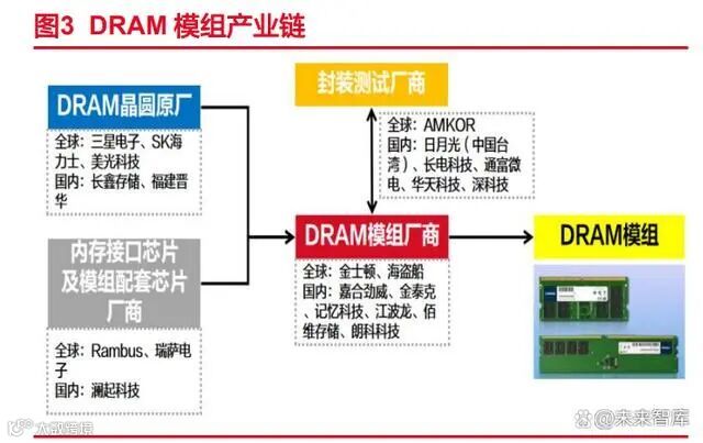 (3)IDM 厂商主导全球 DRAM 模组市场,市占率将近 90%。DRAM 模组厂商分为 IDM 厂商和第三方模组厂,前者如三星电子、SK 海力士、美光科技、南亚科技等,利用其 芯片制造能力销售自有品牌模块(或自有模块专用品牌),此外,他们还向第三方模组厂出 售 DRAM 晶圆。第三方模组厂从 IDM 购买 DRAM 芯片,通过封测厂商封装 DRAM 芯片, 并将模块出售给包括 OEM、大规模提供商和渠道分销商在内的最终客户。目前 IDM 厂商主 导服务器市场,第三方模组厂关注 PC(笔记本电脑、台式机和工作站)市场,由于需求疲 软和 LPDDR 在笔记本电脑中的渗透,预计该市场将下降,Yole 预计第三方模组厂市场份 额有望从 2021 年的 17%下降至 2028 年的 9%。