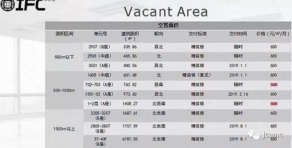 IFC待租数量和面积按照SK大厦物业的规定,一般签约最低两年起签。如果准备退租,则需要提前半年通知物业,物业有充分时间寻找下一个租户。但半年时间加两个金融机构的营业部搬走后又有几个月,意味着近一年,都没有租出去。场地依然空置了大半年租不出去。