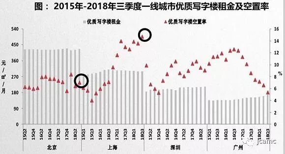世邦魏理仕(CBRE)发布的《2018中国房地产市场分析》报告显示,2018年一线城市写字楼租金价格走势,除广州是特例出现上涨外,其他一线如上海、深圳等地写字楼租金均出现下调。而北京整体写字楼市场租金未有明显改变,但近期北京空置率上升。