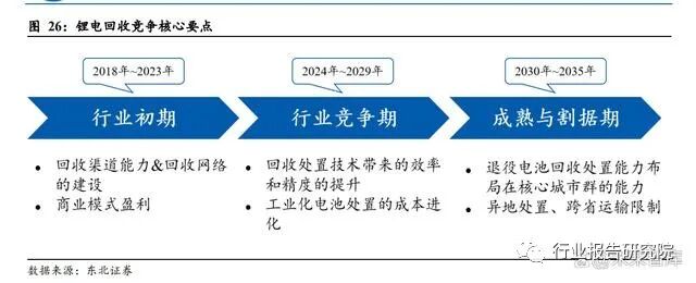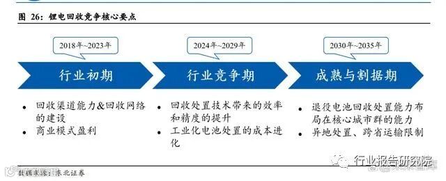行业初期看渠道:在回收行业发展的初期,尤其是参与者大幅增加而退役潮尚未来 临的当下,对于企业而言前端回收渠道的深度布局和回收网络的铺设,各家企业主 要比拼的是资源,保证有充足废旧电池可以参与生产,并形成良好的盈利模式是重 中之重。竞争期看工艺:近年以来,锂价的剧烈波动有望实现一定程度的行业出清,助力进 入第二个行业竞争期,目前行业最大的痛点在于机械自动化拆解的精度和效率,以 及基于对退役电池理解的综合处置和利用方式,主要竞争点就在于技术积淀和行业 理解。成熟期看综合实力:未来进入行业成熟进入第三个时期之后,由于存在运输和区域 上的限制,主要比拼的是企业的综合布局能力和协同能力。