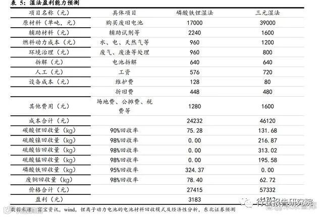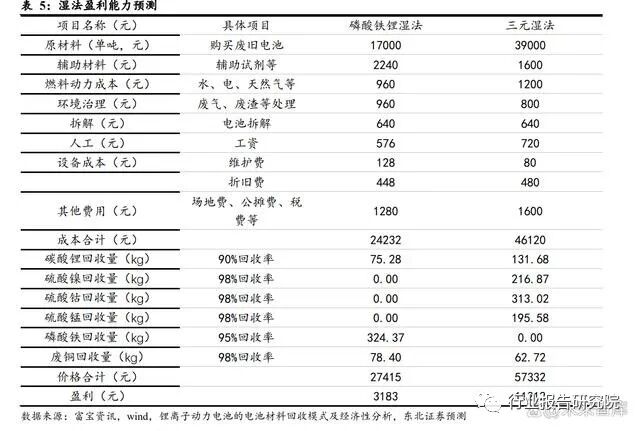 目前再生利用中的湿法工艺为锂电回收中最为主流的处置方法,我们基于此法并按 照一定假设对参与企业的盈利能力进行预测:1. 再生利用的产品主要为碳酸锂、硫酸镍、硫酸钴、硫酸锰、磷酸铁以及废铜,假 设价格分别为价格 25 万元/吨、4 万元/吨、3.4 万元/吨、0.6 万元/吨、1.2 万元/吨和 6 万元/吨。2. 成本包括原材料、辅材、燃料动力、环境治理、拆解、人工、设备以及其他费用, 随着规模增大,相关费用占比会下降。3. 碳酸锂的回收率为 90%,硫酸钴、硫酸镍、硫酸锰、废铜的回收率为 98%,磷 酸铁的回收率为 95%。基于以上假设,磷酸铁锂退役电池的单吨盈利为 3183 元,三元退役电池的单吨盈利 为 11212 元。