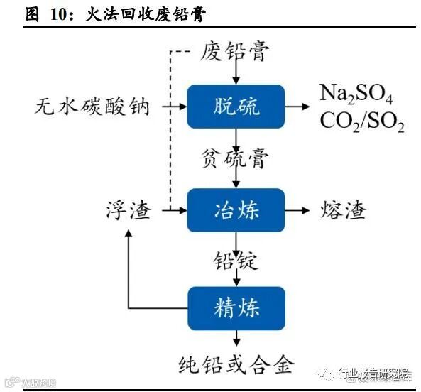 从铅酸电池中再生铅的技术路线包括湿法和干法两条路线。火法主要的再生方式为还原熔炼。干法首先通过化学方法脱硫,然后将剩下的贫硫 膏放入熔炼,再加入还原剂、熔剂,如铁屑、碳酸钠、石灰石、石英和萤石等,高 温下将铅膏熔化,得到粗品,精炼后得到铅。湿法主要再生方式为电解法。湿法的主要特点是在冶炼过程中没有废气、废渣的产 生,铅的回收率可达 95~97%。湿法首先进行脱硫处理,然后通过化学浸出得到富 铅溶液,最后点解得到铅。环保趋严,湿法重视度提高。湿法克服火法冶炼的高能耗、高铅挥发损失、高污染 等缺陷,具有高效生产纯金属、产品输出量大和排放量少等优点。在环境保护要求 日益严格的情况下,湿法冶炼工艺在废蓄电池处理领域受到越来越多的重视。