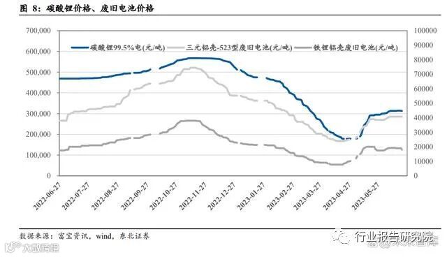 镍钴稀缺金属和锂资源价格上涨推动产业快速发展。早期电池回收主要关注的是镍 钴等稀缺金属的价值。2021 年起,由于对于电池的需求量不断提升,带动锂资源价 格不断上涨,也改变了原先只关注镍钴资源的回收模式,同时带动了废旧电池总价值量的持续提升。显而易见的经济效应使得众多新参与者进入回收市场,推动了回 收前端市场的壮大,也带动后端的回收产业快速发展。