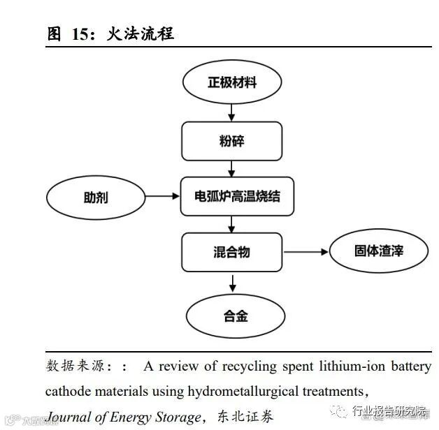 再生过程是再生利用中最核心的工艺步骤,包括火法、湿法、直接修复法。火法:高温烧结,提取镍钴为主。早期锂电池正极材料以三元材料为主,欧美国家采用火法进行回收,通常将正极材料为主的电池破碎产物粉碎后和助剂混合,然后 直接再电弧炉中进行高温烧结,最后得到合金材料。火法的重点在于回收金属中的 钴、镍等贵金属元素。