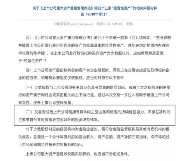 证监会9月10日中午发布“关于《上市公司重大资产重组管理办法》(下称)第四十三条‘经营性资产’的相关问题与解答(2018年修订)”,对上市公司收购少数股权时“经营性资产”的范畴做出解释。