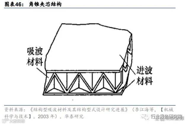 根据《结构型吸波复合材料研究进展》(黄科等,【高科技纤维与应用】,2010 年 12 月), 结构型吸波材料是在先进复合材料基础上发展起来的双功能复合材料,它既能吸波又能承 载,可成型各种形状复杂的部件,如机翼、尾翼、进气道等。国外结构型碳纤维吸波复合材料已经在隐形战机和导弹中得到了较为广泛的应用。根据《结 构型碳纤维吸波复合材料的研究及应用》(李晶晶等,【纤维复合材料】,2012 年 6 月),美 国 F-22、F-117、B-2 等隐身飞机的翼面前后缘、副翼、襟翼、安定面、机身边条、进气道 等均采用了轻质高强高模的碳纤维吸波复合材料,B-2 隐身轰炸机的机翼蒙皮是一种六角形 蜂窝夹芯碳/环氧吸波结构材料,AGM-129 空射巡航导弹在弹翼、尾翼和弹身蒙皮等部位应 用了碳纤维吸波结构材料;俄罗斯的 X-55 巡航导弹采用了吸波结构弹翼;日本 ASM-1 空 舰导弹和 SSM-1 地舰导弹采用了吸波结构弹翼和稳定舵面;欧洲研制的战斗机 ACA 中采 用了高达 40%的结构型吸波复合材料,EF-2000 中也采用了大量碳纤维吸波复合材料,法 国达索公司研制的隐身靶机采用全复合材料设计。同时,某些雷达吸波结构材料已达到产 品批量生产状态,如马可尼公司设计制造的雷达吸波结构、蜂窝吸波构件、吸波胶带、吸 波泡沫、雷达罩以及其它织物型吸波结构等。