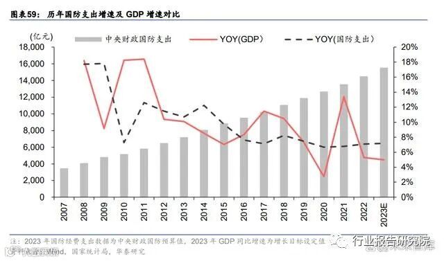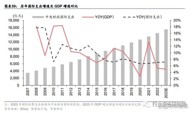 国防预算增速连续突破 7%,强军形势紧迫。在今年政府预算草案报告中显示,2023 年我 国国防费预算约为 15537 亿元人民币,同比增长 7.2%, 增速较上年提升 0.1pct,连续两 年增速突破 7%。当前国际环境恶化,区域冲突和大国对抗不断升级,国防投入提速具有合 理性和紧迫性,我国国防实力与经济水平尚不匹配,军工处于补偿式发展阶段。
