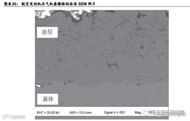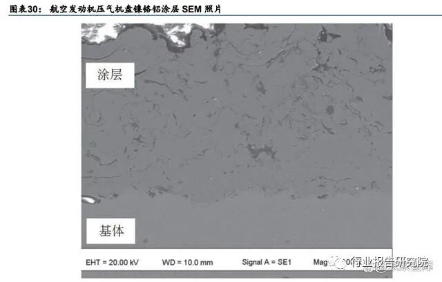 粘结层:根据华秦科技招股说明书,金属粘结层主要解决了耐温隐身涂层材料的附着力和 抗热震性能等应用性能较差的难题,在高温合金基体上,设置粘结层可以提高高温合金基 体和红外隐身涂层的结合强度。根据《航空发动机涂层技术研究及进展》(孙勇汉等,【涂 层技术】,2013 年 9 月),以镍铬铝钇(NiCrAlY)涂层为代表,镍铬铝钇粘结层属于抗高 温氧化涂层,可耐 800-1100℃的高温,在高温下能形成致密的氧化物保护膜,阻挡 O 元素 向内扩散以保护基体高温合金不被氧化,并避免环境介质的腐蚀。