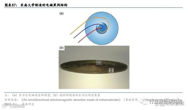 超材料吸波隐身的另一个体现是关于电磁黑洞,即通过效仿物质在“黑洞”引力场的影响 下在空间中的弯曲运动轨迹,实现电磁波能量的全向宽频吸收。2010 年,东南大学团队通 过类比光学黑洞的理论,采用具有渐变折射率的非谐振型超材料外壳和具有大损耗介质内 核的结构,首次制造了微波频段的全方位电磁黑洞,该结构可以实现各方向入射的电磁波 螺旋式地向内弯折,最终被内核的损耗介质吸收,在微波频段的吸波率达到了 99%。