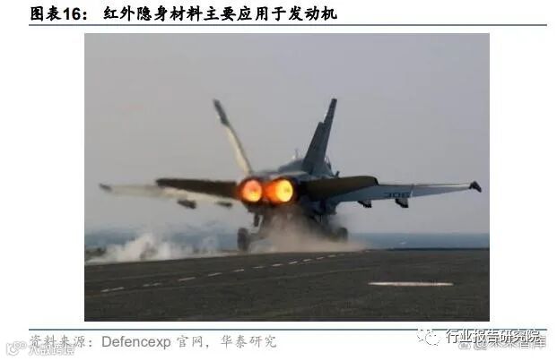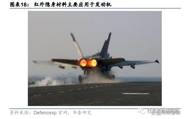 “隐身时代”来临,新一代先进装备均采用了隐身技术。军机方面:根据《武器装备隐身 材料的发展现状及趋势》(贾爱珍等,【科技展望】,2016 年 12 月),F-117A 隐身攻击战斗 机、F-22、F-35 先进战斗机以及 B-2 隐身战略轰炸机均采用了最先进的隐身技术;发动机 方面:根据《航空发动机隐身技术分析与论述》(邓洪伟等,【航空科学技术】,2017 年 10 月),四代战斗机及未来的隐身飞机对发动机提出了较高的隐身指标要求。而发动机后腔体 及其内部件和边缘等产生的雷达散射信号、后腔体及其热端部件和尾喷流等产生的红外辐 射信号占整个飞机尾部方向特征信号的 95%以上。