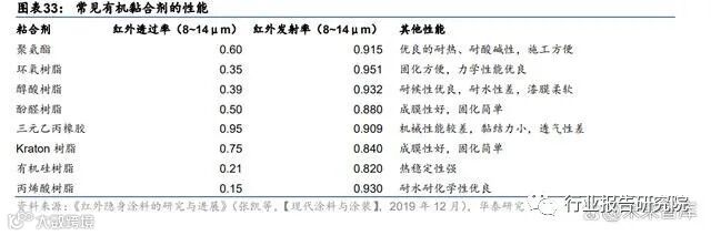 功能层:根据《红外隐身涂料的研究与进展》(张凯等,【现代涂料与涂装】,2019 年 12 月 发表),红外隐身材料通过降低目标表面红外辐射特征,使得红外成像探测无法识别目标体。按照途径,可分为控制发射率和控制温度两类。通过控制发射率来实现目的的红外隐身材 料,主要有涂料和薄膜两类。涂料通常由粉体填料和黏合剂配制而成。黏合剂的红外波段 高透明或低吸收性能以及良好的物理性能,是红外隐身涂层的一大技术难点。黏合剂使涂 料牢固地贴合在基体表面,起到保护填料的作用,而粉体填料在提高涂层红外隐身方面起 到主要作用。