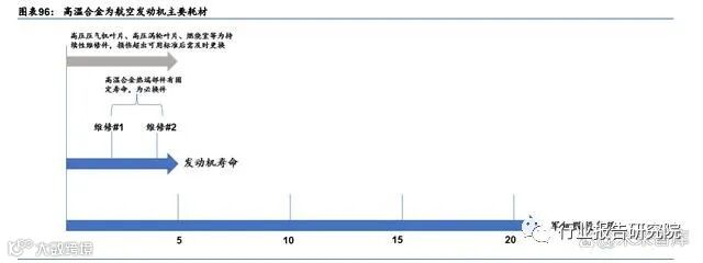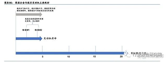由高温合金等材料制成的热端部组件构成了航空发动机主要的维修市场。根据《航空及发 动机构造与维修管理》(蔡景等,【北京航空航天大学出版社】,2015),航空发动机维修工 作根据其内容的不同可以分为:1)航线维修和定期检修;2)返厂大修。其中,返厂大修 涉及发动机的拆解,以及轴、盘等转子部件的更换或修理,返厂大修主要包括性能恢复和 时寿件更换两大部分。在经历长时间运行后,发动机的状态会下降,这时就需要对其进行 修理,理论上来说,通过返厂大修后,发动机能够完全恢复其原有的可靠性,能够继续执 行另一个大修周期的任务。