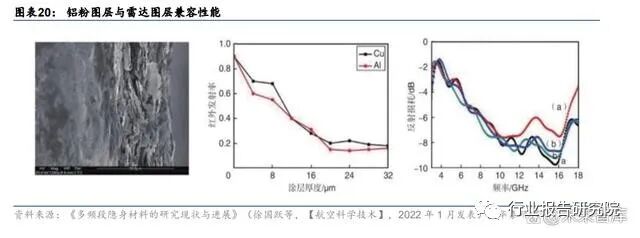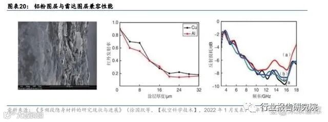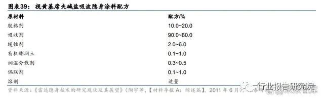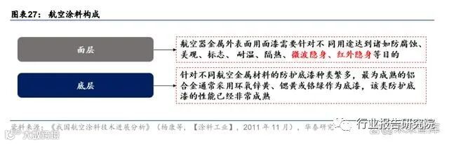 隐身涂层的本质即为航空涂料的一种,其结构机理万变不离其宗。虽然隐身涂层整体技术 趋势不透明性较高,但我们认为隐身涂层的本质即为航空涂料的一种,其涂层结构也应以 “底层”+“面层”为主,其中面层即为功能层,起到红外隐身或雷达吸波的作用,而底层 的作用为强化面层与基层材料(发动机、军机表面)的结合强度。根据《苏-27 飞机特种涂 料的应用》(吴永明等,【现代盐化工】,2019 年 4 月),苏 27 战斗机防护系统由表面氧化 处理+底漆(ЭΠ-076 底漆)+面漆(两层ЭΠ-140 面漆)组成;飞机外蒙皮镁合金的防护 系统,所采用的油漆与内蒙皮镁合金相同,只是先用硫酸阳极化处理镁合金件的表面,并 经铬酸盐填充。