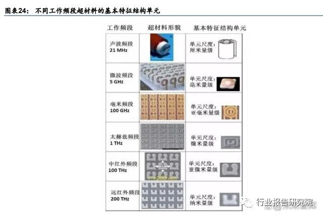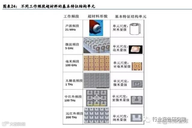 超材料作用范围可以横跨整个波谱频段。理论上,针对不同的波长,都可以设计出在此波 谱范围起作用的超材料。结构特征单元的尺度及形貌由工作波段的波长决定。典型的超材 料有对光起作用的光子晶体,其单元大小在纳米和微米量级;对电磁起作用的左手材料、 超磁材料,其单元大小在微米到厘米量级;对声波起作用的声子晶体、金属水,其单元大 小在厘米到米量级。