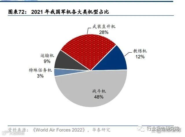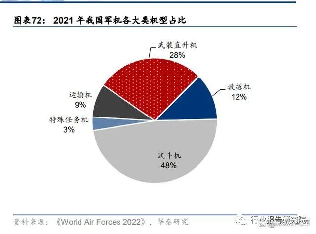 从结构上看,我国军用飞机二代及二代半飞机占比仍然较高,信息化程度高、综合战斗力 强的新机型配备不足。以战斗机为例,美国的三代机占比 81%,四代机占比 19%。而我国 二代机占比 47%,三代机占比 52%,四代机(J-20)仅少量列装。过去几十年受制于先进 机型的研发和批产进度,尤其是部分核心部件的国产化能力,我国军用航空市场的庞大需求一直无法得到满足。但是近年来随着歼 15/16、轰 6K/N 等的加速列装,尤其是歼 20、运 20、直 20 等我国新一代军用飞机的陆续批产,标志着我国新一代机型的拼图已基本补全, 亟待量产配套跟进。我们认为接下来十年,是军用飞机换装的稳定期,也是我国航空发动 机产业发展的加速器。
