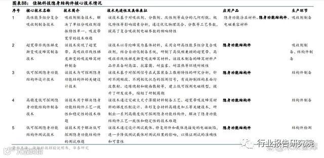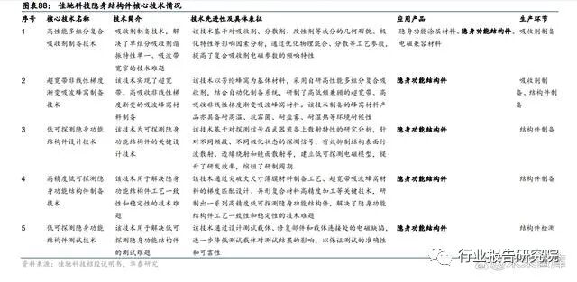 目前以华秦科技、佳驰科技、光启技术为代表的隐身材料龙头企业均在向隐身结构件方向 拓展。华秦科技方面,根据公司招股说明书,公司成功研制的结构隐身材料具有非常好的 隐身功能及物理性能,可替代部分现有武器装备金属材料制造的结构件,实现结构和隐身 功能的一体化。目前,该系列产品已经实现了小批量生产,在多个型号的武器装备中得到 应用与验证;佳驰科技方面,根据招股说明书,公司所生产的隐身功能结构件系列产品兼 具电磁吸收和高强度两种特性,可作为承载结构件;光启技术方面,根据公司公告,其核心产品超材料本身为装备结构功能一体化的主流技术,公司第三代超材料技术的结构件产 品已转入批产阶段。