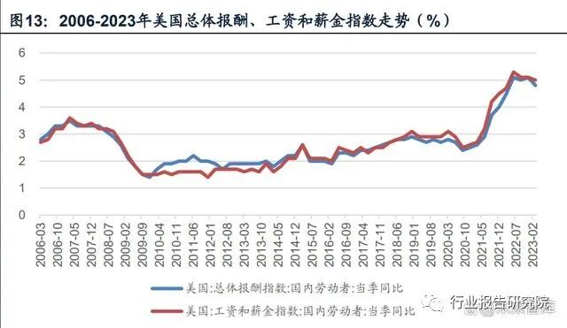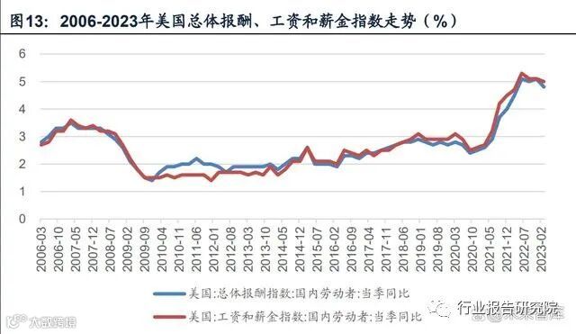 就业方面,从ADP就业人数和新增就业人数看,美国就业市场较疫情期间出现明显 好转,但美国国内劳动者总体报酬指数、美国国内劳动者工资和薪金指数均较疫情前大幅提升后出现回落,美国私人非农企业全部员工每周工资总额指数仍处于较高 位置,薪资增速边际放缓较慢,劳动力市场依然紧张。