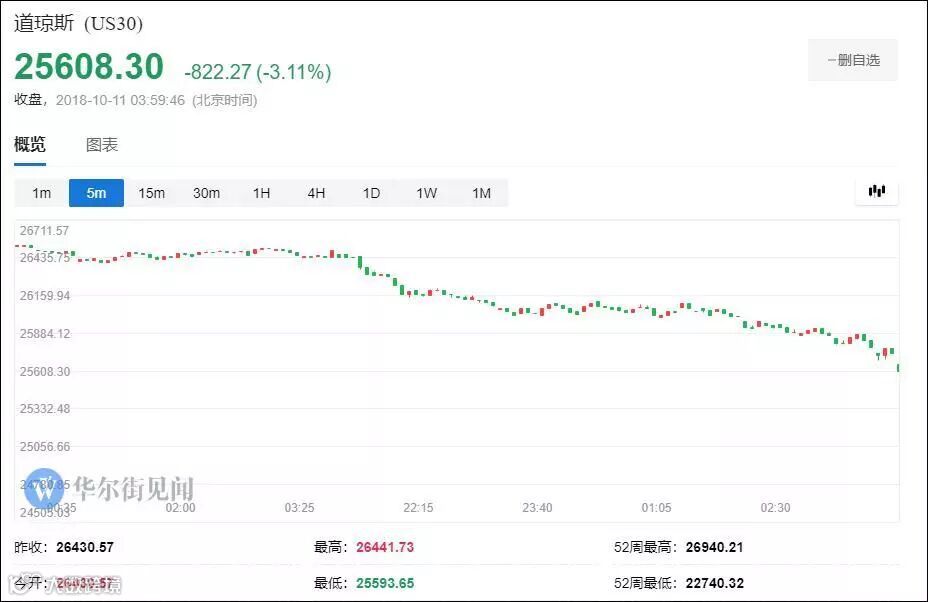 当天,道指报收于25598.74点,跌幅3.15%,创今年8月16日以来收盘新低。在过去五个交易日中,道指有四日下跌,累跌近900点,10月以来累跌2.5%。
