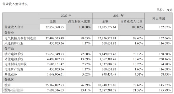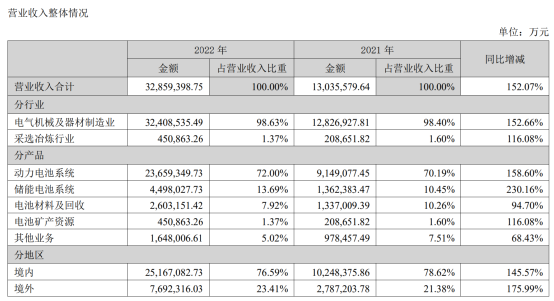 细分来看,在动力电池业务方面,宁德时代去年营收达到2365.93亿元,同比增幅达到158.6%,这一业务收入占整体营收达到了72%,较去年同期增长1.81个百分点。