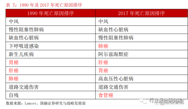 根据 Lancet 对 1990 年到 2017 年中国各省的前 25 位死因变化分析,癌 症已经成为国人最主要的死亡原因之一。由于癌症的发病宗数在不停增长, 且有效治疗方法越来越多,而新兴的靶向治疗价格较高,这导致癌症的治疗 费用也在不断增长,癌症诊疗市场不断扩容。根据 Frost & Sullivan 的数据, 2019 年中国癌症治疗的总费用高达 2407 亿美元,预计将在 5 年间保持 9.8% 的年复合增速,到 2023 年时将达到 3517 亿美元,预计到 2030 年,治疗总费 用将达到 5920 亿美元。
