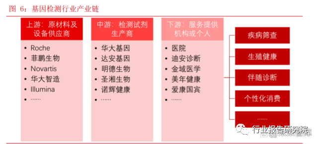 不同基因测序技术可以用于不同领域,但第二代测序技术以其通量高、 准确的优势用于各个领域,本篇报告主要以第二代测序技术为对象。基因测序产业链的上游是基因测序相关仪器、耗材及试剂供应商,提供 基因测序平台和解决方案。基因测序技术是基因测序仪的核心,在多种基因 测序技术中,以 Illumina、Thermo Fisher 和华大智造为代表的高通量测序 技术是目前市场较为主流的测序技术。基因测序产业链的中游是以实验室、 研究机构、测序服务公司为代表的服务提供商,其构建大规模测序平台,并 为其他用户提供测序,开发基因测序相关应用。基因测序产业链的下游是以 政府、药企、医院及广大人群为代表的测序相关应用或服务的终端消费者。目前,产业下游逐步成熟的应用领域包括:疾病筛查、生殖健康、伴随诊断、 个性化消费等。