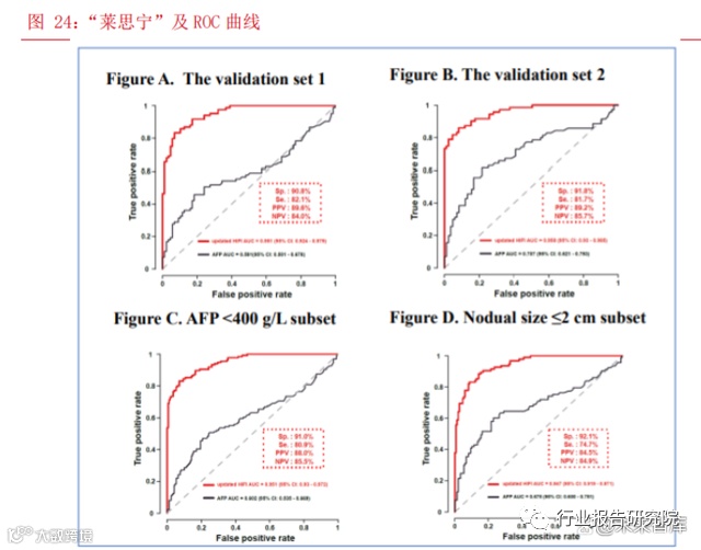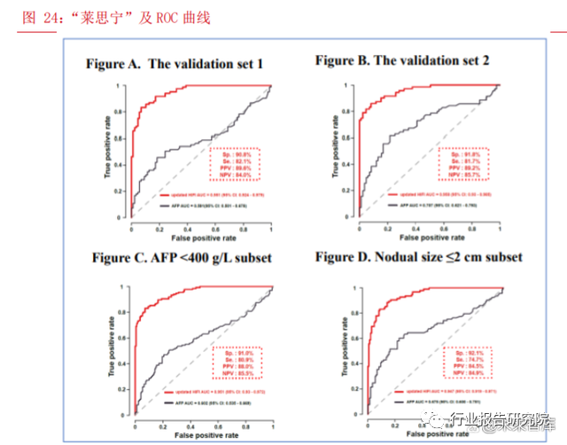 另一早筛领域领头公司和瑞基因在今年发布了多癌种早筛产品“全思宁”, “全思宁”是目前全球首个采用游离 DNA(cfDNA)多维度全基因组测序(WGS) 技术的多癌种早筛产品,可以筛查肺癌、食管癌、胃癌、肝癌、胰腺癌、结 直肠癌在内的 6 大中国高危高发癌症,目前已达到灵敏度 87.58%、特异性 99.09%、溯源准确性 82%的国际领先性能。和瑞基因的肝癌早筛拳头产品“莱思宁”,在一项对两个纳入肝硬化结节 和肝细胞癌的患者队列展开回顾性(共 171 例, 87 例肝硬化结节、84 例肝细胞癌)与前瞻性(共 156 例, 85 例肝硬化结节、71 例肝细胞癌)队列验 证的研究中数据表现良好,在回顾性队列验证中, AUC(曲线下面积)达到 0.951,90.8%特异性下灵敏度达到 82.1%;前瞻性队列验证中 AUC 达 到 0.958,91.8%特异性下灵敏度达到 81.7%。亚组分析显示,该模型 在 AFP 阴性和结节大小≤2cm 的样本中均表现出良好的 AUC 值,分别为 0.951 (灵敏度 80.9%,特异性 91.0%)和 0.947(灵敏度 74.7%,特异性 92.1%)。