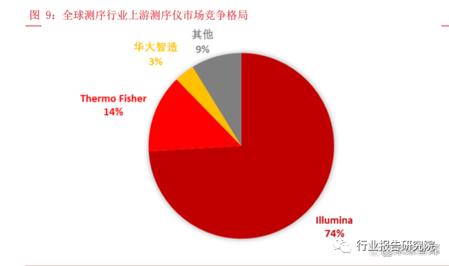 基因测序行业上游集中度高。因为基因测序行业上游涉及复杂的多学科 交叉和大量精密仪器制造和组装,源头性技术及完整的专利布局会构筑较高 的技术壁垒。目前从全球市场来看,基因测序行业巨头 Illumina 因其业务具 有先发优势,市场占有率较高,具有一定的垄断地位。根据 Grand View Research 的 2020 年发布的市场报告,2019 年全球测序行业上游市场中 Illumina 的市场占有率约为 74.1%,Thermo Fisher 的市场占有率约为 13.6%,华大智造占全球市场份额约为 3.5%,相较于 Illumina 和 Thermo Fisher 的全 球市场份额更低。