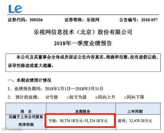在大虾截稿之前,乐视发布了晚间最新公告,披露了2018年第一季度业绩预告,称今年一季度亏损3.07亿-3.12亿。同时本季度的广告收入、终端收入以及会员收入同比均出现大幅下滑。