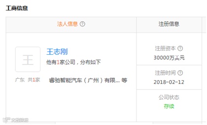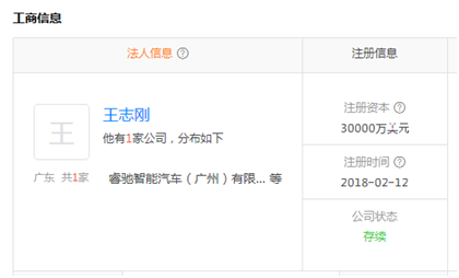 天眼查显示,睿驰汽车于今年2月12日,在广州市南沙区注册成立,注册资本3亿美元,法人叫王志刚,其籍贯与贾跃亭老家一致,位于山西省襄汾县汾城北膏腴村。