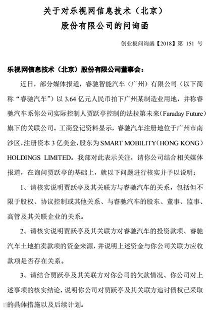 今日,乐视网收到了深交所问询函,不过这次问的不是乐视,是贾跃亭。问询近日部分媒体报道的“贾跃亭国内买地造车”事件。