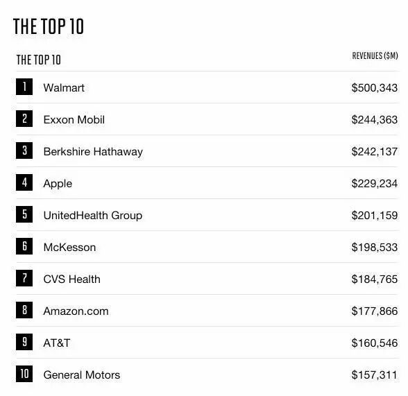 在今年的榜单上:沃尔玛连续第六年蝉联榜首,石油天然气巨头埃克森美孚重新夺回第二名位置,将巴菲特的伯克希尔-哈撒韦挤到第三。苹果公司位列第四,但它是美国500强中最赚钱的公司,盈利483.51亿美元。从12位跃升至第八位的亚马逊收入增幅远超其它前十强的公司,达到了30.8的增长。