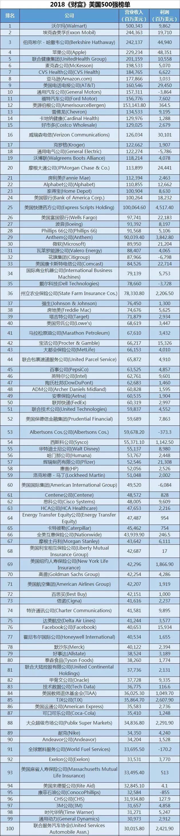 榜单显示,苹果依旧是2018年榜单中利润最高的公司,净利润达到483亿美元。按照净利润衡量,伯克希尔位居第二,净利润为449亿美元。Verizon和AT&T分别排在第三、第四位。沃尔玛只排在第20位,该公司是出了名的利用低价格蚕食竞争对手。