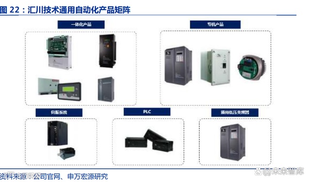 汇川技术是国内工业自动化控制龙头。公司成立于 2003 年,2004 年生产出第一批机 器,2008 年推出 PLC、伺服产品,2009年“汇川永磁同步电机驱动控制软件”荣获中国 国际软件博览会金奖, 2010 年上市,2010-2019 年历经三次组织变革,取得远超行业平 均的持续增长,2021 年年产 1100 万台伺服电机项目进一步扩大产能,2022 年收购大连 智鼎科技,完善大功率变频电机布局。目前,公司产品覆盖通用自动化、电梯电气大配套、 新能源汽车、工业机器人、轨道交通五大类,其中通用自动化包括变频器、伺服系统、控 制系统、工业视觉系统、传感器、高性能电机等核心部件,产品线齐全。