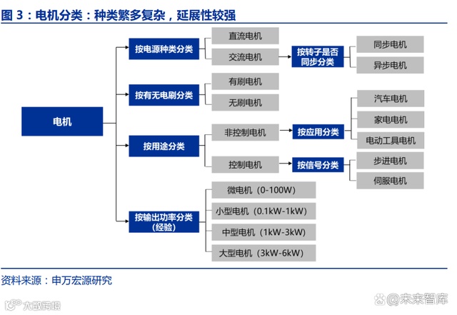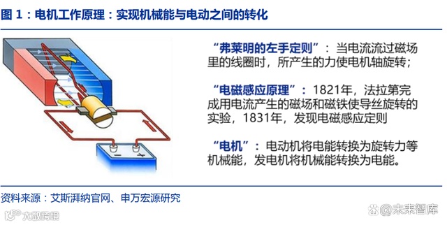电机一般指电动机,亦称“马达”,可将电能转换为机械能,为用电器或各种机械提 供驱动力,在现代工业和生活中应用极为普遍。电机的基本原理为电磁感应定律——电能 在线圈上产生旋转磁场,并推动转子转动。电机的基本构造包括:定子(铁芯、绕组和基 座)、转子(铁芯、绕组),此外不同类别电机可能配有电刷、传感器、驱动器、风扇等 配件。电机原理虽然简单,但高端设计十分复杂,牵涉设计、工艺和设备等环节,涵盖电 磁学、摩擦学、热、流体、振动、声学等自然科学和相关技术工程领域。