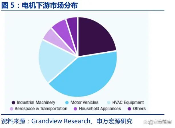 电机的下游应用市场极为广泛,空间千亿美元。电机作为必不可少的关键基础机电部件,广泛应用于家电、汽车、信息处理器、视听设备、工业自动化等领域。以家庭场景为例,根据祥明智能招股说明书援引高工咨询的数据,发达国家微特电机的家庭平均拥有量 为 80-130 台,而中国大城市家庭平均拥有量大约在 20-40 台;汽车为最主要电机细分市场,一辆商用车采用超过 40个电动机,从低功率到高功率不等。根据 Grandview Research 的研究数据,2020年全球电机市场规模为 1427 亿美元,预计 2021-2028 年全球电机市 场规模复合增长率将达到 6.40%。从下游细分市场来看,汽车占比最高,占 40.5%,其次 为工业机械、HVAC 设备(供热、通风与空气调节)、空调、运输、家电等。