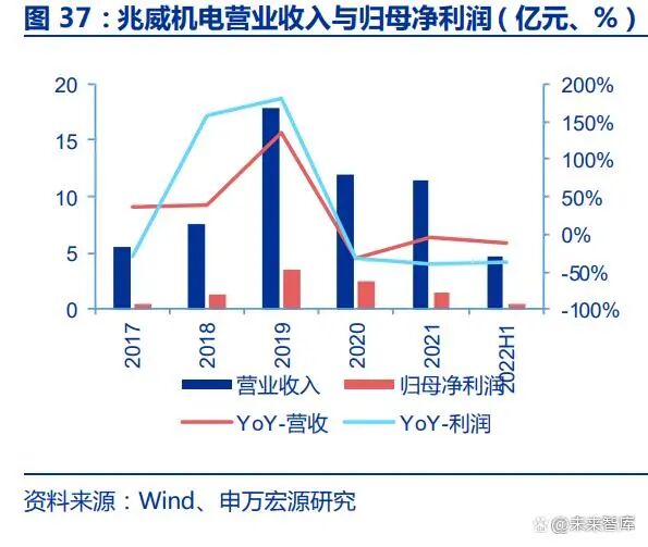 疫情下消费市场承压,导致短期业绩扰动。2021年公司实现营业收入 11.40 亿元,同 比下降 5%;归母净利润 1.48 亿元,同比下降 40%,其中微型传动系统、精密注塑件和精密模具分别占比 65%、30%和 5%。2021年毛利率、净利率分别为 29.73%、12.94%。2022H1 公司实现收入和归母净利润 4.69 亿元、0.55 亿元,分别同比-12.44%、-37.86%, 主要受到智能家居、服务机器人、通讯业务板块的负面影响;汽车电子和医疗领域分别实现 26.77%和 16.46%的正增长,为公司积极拓展的重点领域。