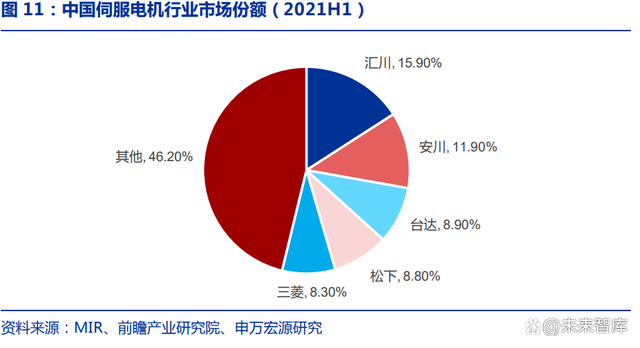 伺服电机行业 65%份额为外资品牌,高端市场基本被外资垄断。根据 MIR 数据,我国 伺服电机竞争格局中外资品牌占 65%,国产品牌占35%。根据前瞻产业研究院报告,目前 主流品牌可分为欧系、日系和国产品牌等类别,其中欧系日系占据中高端市场,国产主要 集中在中低端市场。①欧系品牌占比 20%:如西门子、伦茨、博世力士乐等,过载能力高、 动态响应好、驱动器开放性强,但价格昂贵、体积重量大;②日系品牌占比 45%:如安川、 三菱、松下等,品牌性能和价格相对低、体积小、重量轻、可靠性和稳定性强,但动态响应能力较弱、开放性较差低,总体上性价比更高,最适合中端需求;③国产伺服占比 35%:如台湾台达、汇川技术、华中数控等,产品基本成熟,精度和可靠性较差,中小功率居多, 中低端伺服系统已实现大规模量产,但高端伺服系统尚未形成商品化和批量生产能力。