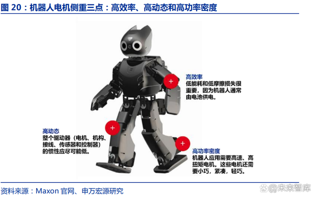 人形机器人电机有三个关键点:高效率、高动态和高功率密度。①高效率:低能耗和 低摩擦损失很重要,因为机器人通常由电池供电,能经受得起苛刻的运行条件,可进行十 分频繁的正反向和加减速运行,并能在短时间内承受过载。②高动态:整个驱动器(电机、 机构、接线、传感器和控制器)的惯性应尽可能低,电动机从获得指令信号到完成指令所要求的工作状态的时间应短。③高功率密度:机器人应用需要高速、高扭矩电机,这些电 机还需要小巧,紧凑,轻巧。