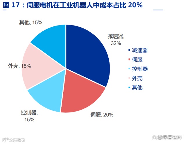 工业机器人(多关节机器人)通常有 6 个关节,对应 6 个电机。控制器、伺服电机和 减速器被称为工业机器人的三大零部件:1)控制器是机器人的“大脑”,通过硬软件结合来控制机器人的运动位置、姿态和轨迹;2)伺服电机是机器人的“驱动力“,根据控制器 发出的命令输出力矩,动态控制机器人的速度和位置;3)减速器用于降速增矩:伺服电机 一般输出的转速高、力矩小,不能满足机器人本体的运动需求,需要通过减速器来降低转 速、增加力矩。根据高工机器人数据,伺服电机在工业机器人总成本中占比 20%。