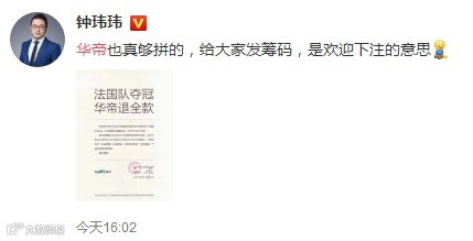 醉了欢颜:太不会说话了吧,应该说 我公司承诺,若法国队夺冠成功,则给予每个购买了华帝夺冠套餐的用户等值奖励。