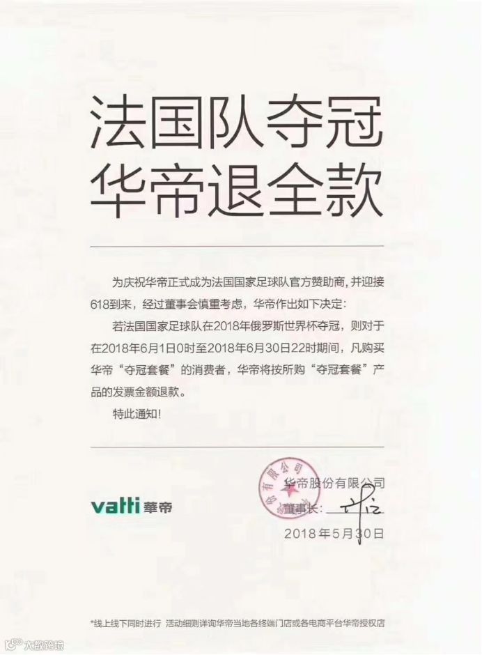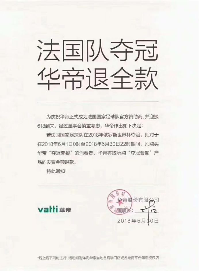 今日,华帝发布一则消息,称如果法国队在本次世界杯中夺冠,公司将对购买了“夺冠套餐”的消费者进行退全款活动。